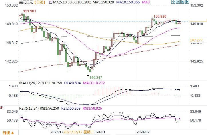 美元指数因此受挫,但美元在很大程度上仍处于区间震荡,交易商还在密切关注经济数据的进一步发展,以寻找美联储何时可能开始降息的新线索。周五当天,日本央行总裁植田和男表示,现在断定通胀率接近持续达到央行2%的通胀目标还为时过早,并强调有必要仔细研究更多有关工资前景的数据。通胀预期和日本央行的政策路径可能将取决于大型企业与工会就加薪问题进行的谈判。工资谈判将带来更多表明日本的通胀正变得更加持久的信号,那么市场预计日本央行将退出负利率政策。日本央行总裁周五稍显谨慎的表态,略微抑制了日元的表现。日线图上,美元/日元似乎存在尝试下穿布林带通道中轨线的倾向,各项技术指标也呈现开始下摆的倾向。若美元/日元近期收盘于150之下,那么日元存在着逆转跌势转而为升的走势。目前上方151的阻力看来不易穿过破。
