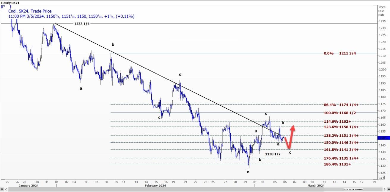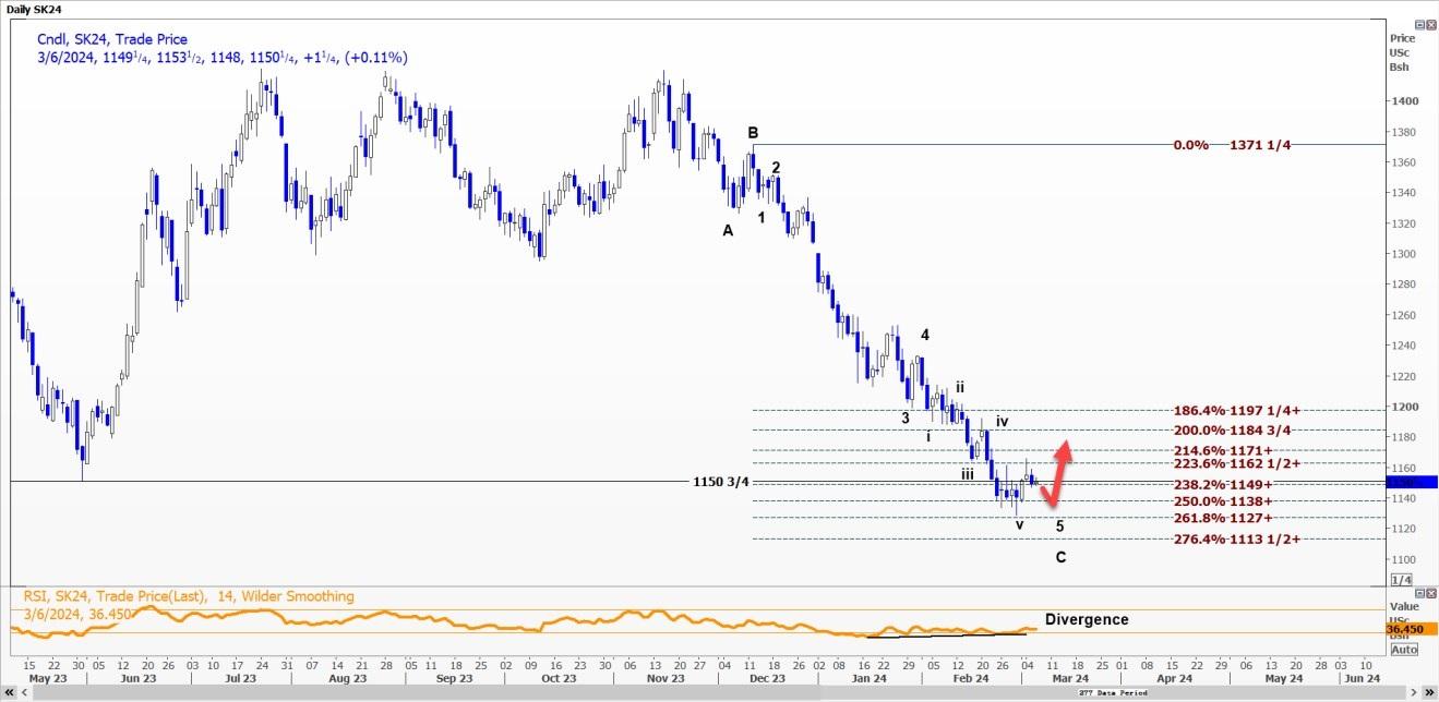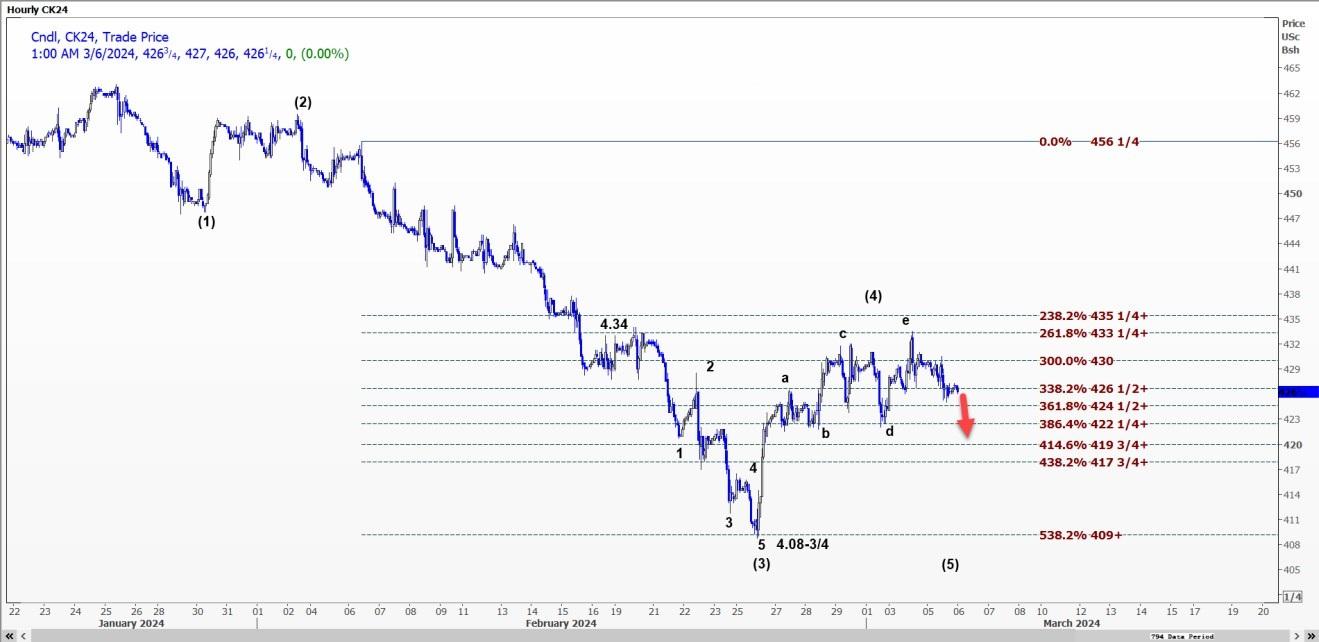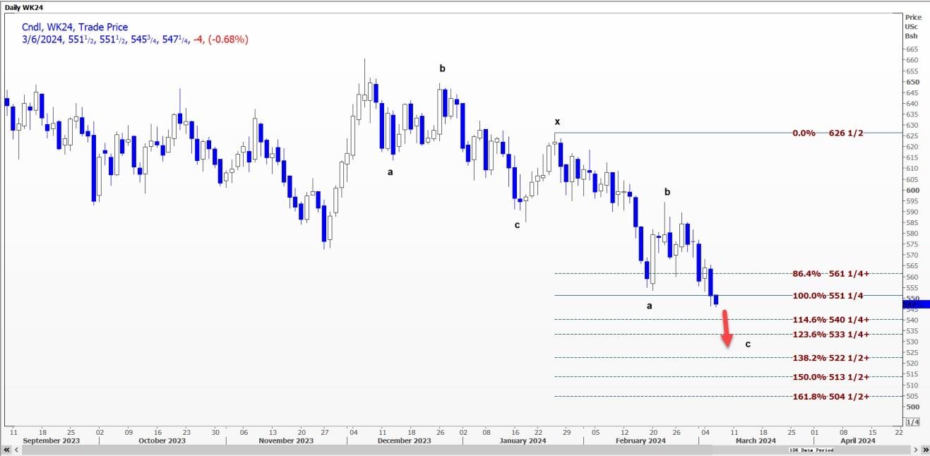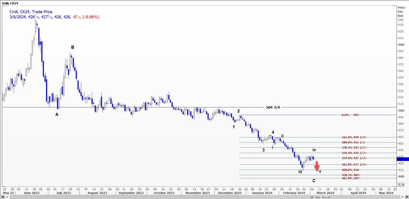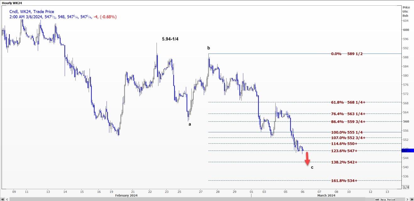 受c浪延长推动,CBOT小麦WK24可能跌至每蒲式耳5.42美元。