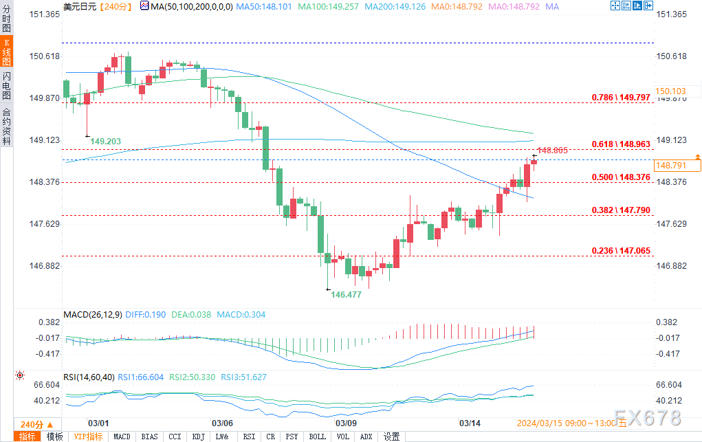 周五(3月15日),美元/日元汇率震荡走高,盘中报148.784美元,涨幅0.34%。美国零售销售数据发布后美元/日元走强。