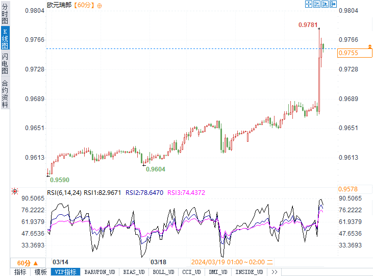 (欧元/瑞郎60分钟走势图 来源:易汇通)