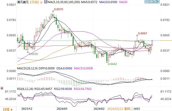 周三(3月20日),美联储周三决定维持利率不变,同时维持今年三次降息的预测,而且主席鲍威尔对通胀发表的讲话令人放心,这平息了投资者对利率的担忧,并提振了风险情绪。为此,隔夜纽约盘中,澳元/美元上涨0.85%,高收盘于0.6585。至于澳联储的降息预期又没有变化将取决于周四将公布的澳洲就业数据,分析师预计继连续两个月表现疲软后,2月就业人口增幅将反弹到至少4万人。如果就业数据增幅可观,那么将会令澳联储进一步延缓降息,且降息幅度也将被预期减少。在这种局面下,澳元或许能获得些支撑而回升。日线图上,澳元/美元再度回升至布林带通道中轨线之上,显示澳元抄底买盘较为踊跃,目前在0.6500附近的支撑较为坚实。上方只有穿越此前的高位阻力0.6630,或许才能看到较明显的上升轨迹。