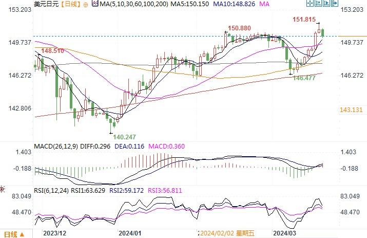 美元兑日元下跌0.18%至151.12,截至周四早间亚盘阶段,已跌穿151.00,最新报价在150.54。此前美联储一如预期维持利率不变,尽管通胀依然高企,决策者仍预计今年美国将降息三次。美联储主席鲍威尔表示,即使近期通胀数据意外强劲,他对物价压力的展望也相对稳定。鲍威尔试图告诉大家,短期内没有任何变化,他对通胀仍有信心,这是他在新闻发布会上传达的主要信息。由此看来,随着经济放缓和通胀持续减速,主要央行基本上都在步调一致地计划降息以刺激经济增长。市场上也正是抓住这一点,在隔夜外汇市场上推低了美元。但是,近期美国通胀报告强于预期,导致交易商进一步降低了对美联储今年降息的押注,目前市场定价美联储年底前将降息81个基点,几乎是2024年初预期的一半。与此同时,没有人预期日本央行会开始一个漫长的加息周期,最终还是会看到美国和日本之间的利率差看起来相当大。交易员们似乎也一时间难以摆脱得了套利交易的诱惑。日线图上,美元/日元短线有所回落,但仍处在此前横盘的顶部150.50之上,技术指标保持上摆,暂时未显现再度反转的迹象。继续留意上方接近152的阻力,若不过,则当心美元/日元形成顶部的风险。