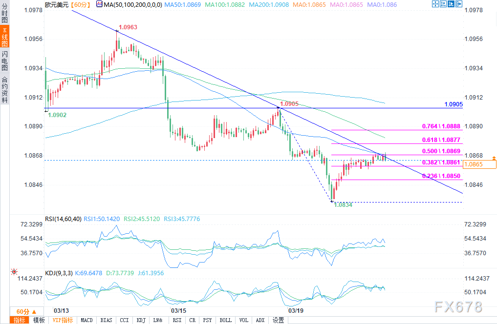在上涨方面,该货币对目前正面临近期从1.0906波动高点跌至1.0834低点的50%斐波那契回撤位1.0870附近阻力。