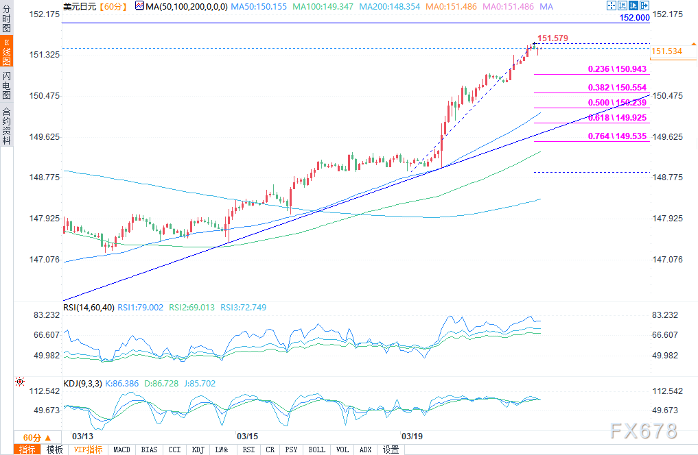 美元兑日元图表上的直接阻力位于151.50附近。