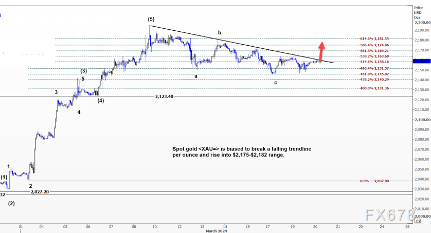 现货黄金偏向于突破2195以来的短线下跌趋势线,升至2175-2182美元区间。
