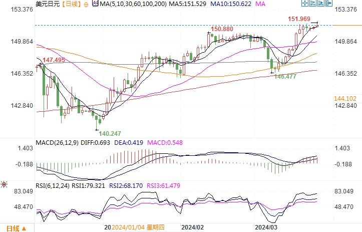 美元指数上涨0.06%至104.28,日元兑美元则下跌0.09%至151.52。周二的数据显示,2月份美国耐用品订单的增幅超过预期,同时由于第一季度的经济增长前景依然乐观,企业的设备支出显示出暂时的复苏迹象。目前投资者纠结的是,如果通胀居高不下,经济增长保持强劲,美联储是否会像目前预期的那样在今年降息三次。市场也正在极力寻找美国经济出现裂痕的迹象,而这些迹象很难找到,耐用品订单数据再次说明了这一点。为此,