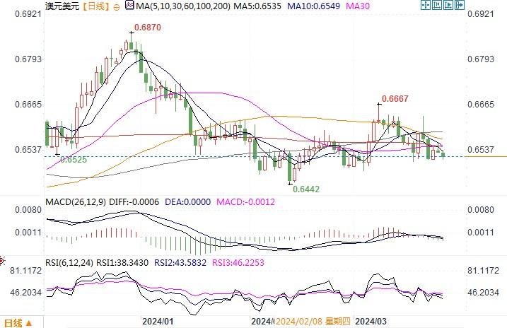 周二(3月26日),受美国表现强劲的耐用品订单数据的影响,澳元当日亚洲累计积的升势在纽约盘阶段遭到化解,当日略微下跌了0.07%,收盘于0.6532。来自周二澳洲的调查显示,消费者对澳洲央行上周维持利率在4.35%不变并为进一步加息敞开大门的决定并不满意,尽管该决定确实淡化了加息的倾向。待周三消费者物价数据公布后,政策前景可能会变得更加明朗一些。市场预计澳洲2月年通胀率将略微上升至3.5%。即便如此,料不会对澳联储的货币决策产生任何大的影响。当前澳元的走势,还是要看美元的表现。因此,本周来自美国的经济数据才是投资者重点关注的方向。技术图形上,澳元/美元整体保持着窄幅区间横盘震荡走势,主要波动区间落在0.6470-0.6600之间。