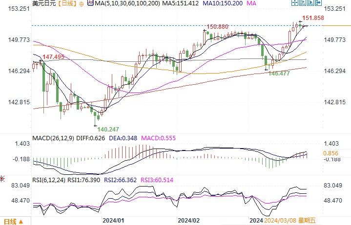 美元兑日元纽约尾盘上涨0.03%,报151.47,略低于上周五触及的四个月高点151.86。在日本财务省财务官警告投机者不要试图削弱日元之后,日元一度上涨,之后回吐了涨幅。日本财务省财务官周一表示,日元目前的疲软并不反映基本面,呼应了最近几天多位政府官员因日元下跌而不断强化的警告。交易员们正在关注152附近的水平,以寻找可能的干预迹象。不过,有分析指出,除非波动性回升,否则政府可能不会介入,并补充说这一因素可能比汇率更重要。目前,大多数主要货币的隐含波动性确实在继续走低,因此这对利差交易来说是一个有利的环境,也就是说我们应该会继续看到投机者借入日元和其他低收益货币,并投资于高收益货币。这反过来可能会继续给日元带来下行压力。日线图上,美元/日元继续停留在年内高位区域,显示美元多头在坚守。但忌惮于日本央行的可能性干预,进一步冲高则显得谨慎。如果日本央行无实际的市场干预行动出现,预料投机者将可能谨慎测试穿越152阻力水平。