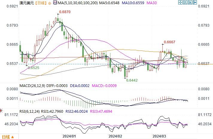 澳元兑美元将盘整。有分析师预计,由于本季度第二个月将有更多的服务业数据,2月通胀同比升幅可能回升至3.6%。1月通胀率则创下两年低位3.4%。若2月份通胀显示回升,有助于降低对澳元降息幅度的预期,或能给到澳元稍微的支持。日线图上,澳元/美元仍偏于弱势,汇价受压于布林带通道中轨线之下,技术指标保持下摆。下方目前0.6500的支撑性较强,短时间内不至于被跌穿。