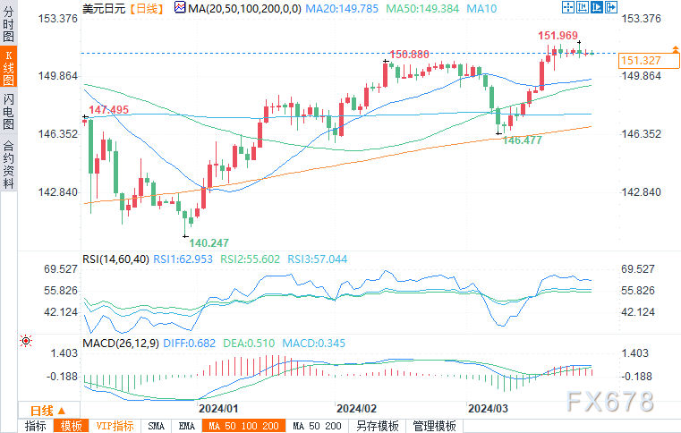 北京时间18:04,美元/日元报151.320/349,跌幅0.03%。欧元/日元报163.1420/780,跌幅0.04%。英镑/日元报190.8540/9070,跌幅0.05%。
