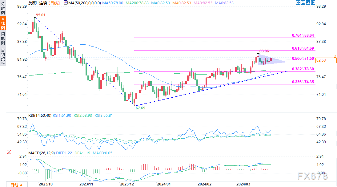 WTI原油期货(5月交割)从去年12月67.97的底部稳步回升,上周达到近5个月高点83.10。然而,由于价格已经向下反转,并在95.02-67.97的50.0%斐波那契回撤位附近形成了一个对称的三角形,上涨似乎暂时被搁置了。