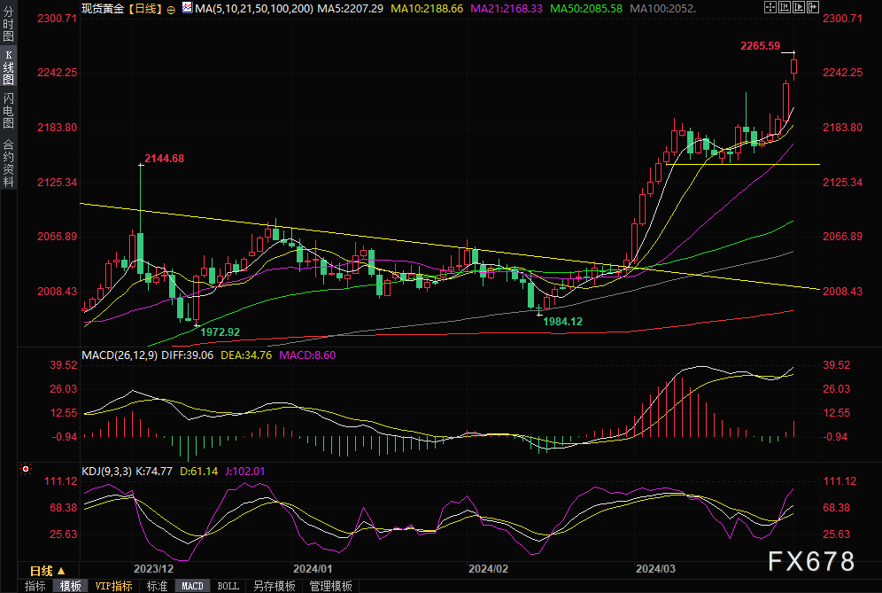 现货黄金价格持续强劲反弹,一度创下历史新高至2265美元/盎司,比上周四收盘价上涨约32美元,上周五黄金市场休市。FXStreet分析师Dhwani Mehta指出,尽管美联储6月政策转向预期支撑了金价,但技术面显示金价面临回调风险。