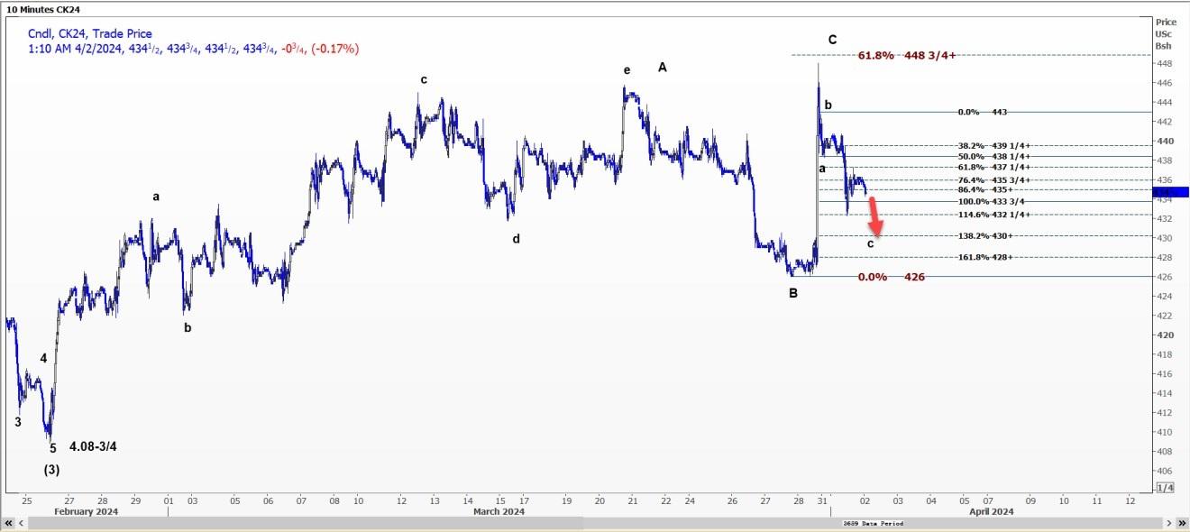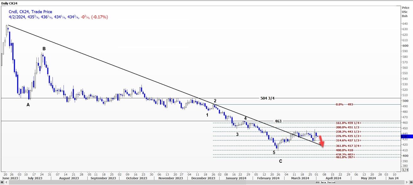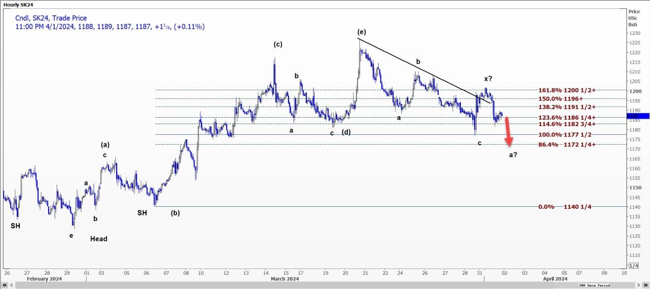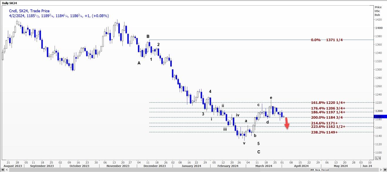 继周一下跌后,CBOT大豆SK24可能会重新触及3月28日每蒲式耳11.77美元的低点。